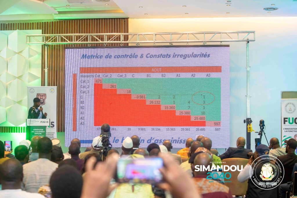 Dans sa présentation, il a indiqué qu’avec la mise en œuvre de cet outil, l’administration est passée de 277 000 à environ 130 000 agents contractuels et fonctionnaires de l’État recensés et biométrisés. Le dispositif a permis d’identifier avec précision le nombre réel de fonctionnaires, de les classer par tranche d’âge, de les structurer selon la hiérarchie administrative et de détecter les cas de doublons, notamment sur les primes. En outre, le FUGAS aurait permis de réaliser une économie estimée à 233 milliards de Francs Guinéens.